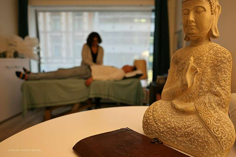 La pratique sur table où vous vous allongez confortablement, habillé, les yeux fermés. Vous n’avez rien à faire. Pendant ce temps, je pose les mains sur deux points spécifiques du corps et pratique la méditation dynamique de Lao-Tseu-Ki®.